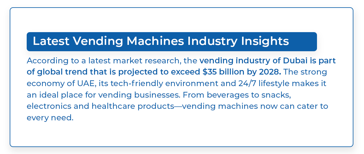 As Dubai continues to grow in digital transformation and providing smart solutions—the vending industry is expected to see a great expansion in coming days. So invest wisely today so you can secure a strong standing in the UAE’s most promising and automated retail industry.